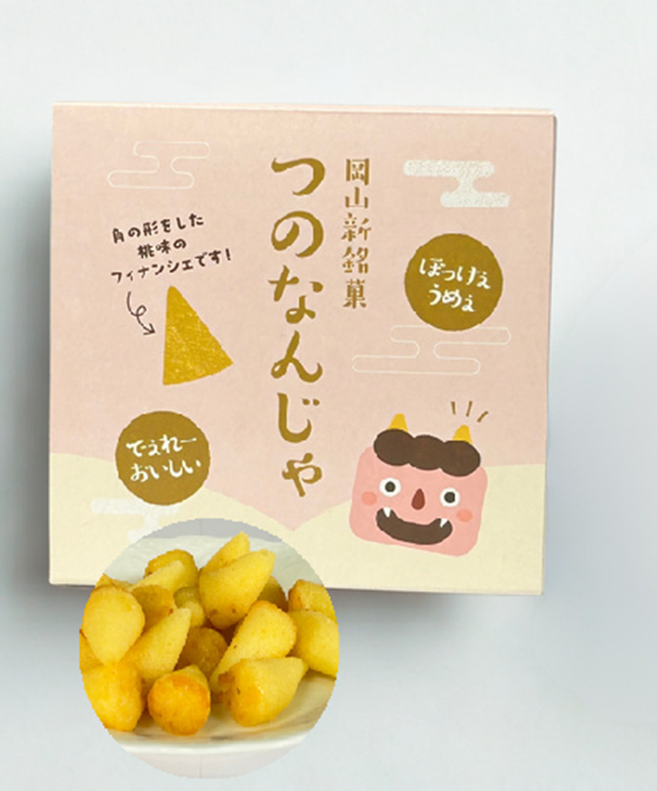 市場に出回らない規格外の岡山県産白桃を活用。岡山と言えば「桃太郎」。桃太郎伝説をモチーフにした「鬼のつの」というユニークな形状で、話題性のある新感覚スイーツに仕上げました。また、「岡山の方言を知ってもらいたい」ということでパッケージには岡山の方言をあしらい、「桃太郎異聞」としてサイドストーリーを開発し、子どもたちにも喜んでもらえるようなユーモアあふれる商品です。