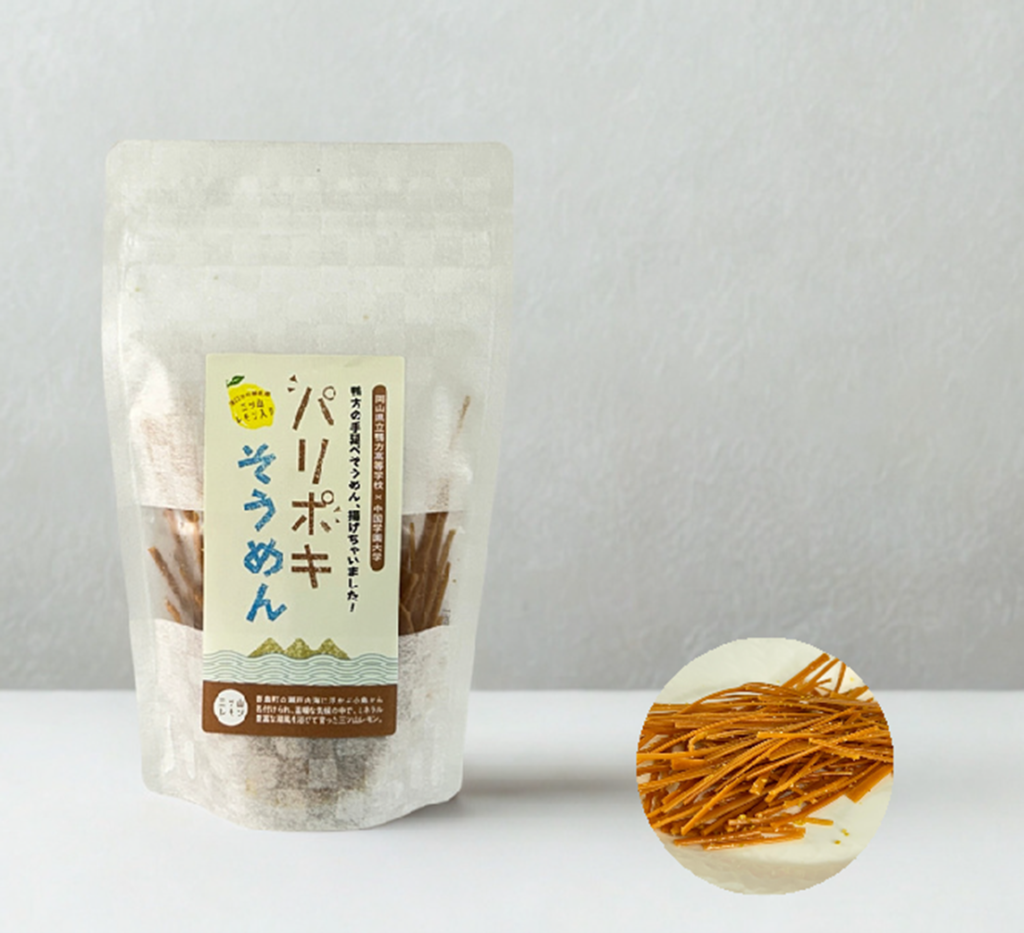 浅口市鴨方町の名産「手延べそうめん」をスナック菓子としてアレンジ。製造過程で生じる「バチ」を有効活用した食品ロス削減に配慮した商品です。また、浅口市が新たな特産品として生産している寄島町の三ツ山レモンを使用し、柔らかい酸味を活かしています。
