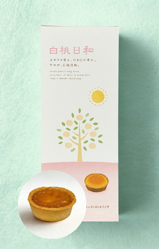 果物王国岡山県産の白桃を生地に練り込んだタルト菓子。食べると桃の風味と果肉が感じられます。岡山県産の桃は高級果実として知られていますが、市場に出せるのは3割程度、残り7割は廃棄もしくは規格外として加工食品用として缶止め(シロップ漬け)されていることに着目。農家の想いを大切にし、地域資源を無駄なく活用することをテーマに開発しました。