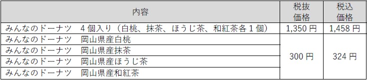 製造を手がけるのは、小麦・卵・乳などのアレルギー特定原材料8品目を使わないお菓子の製造販売を行っている、岡山市の株式会社いぶきです。「みんなのドーナツ」は米粉や豆乳、おからパウダーなどを使用しており、岡山県産の白桃、抹茶、ほうじ茶、和紅茶を使った4種類をラインナップしております。岡山県産素材をいかした、素朴でやさしい味わいをお楽しみいただけます(画像はイメージです)。